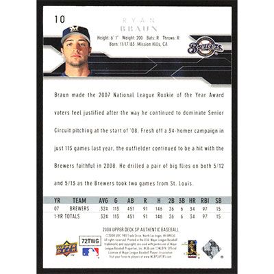 This is a 2008 SP Authentic Ryan Braun baseball card. The card is #10 and pictures show condition.