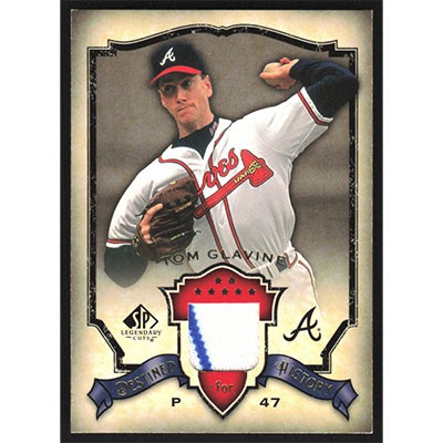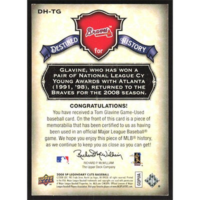 This is a 2008 SP Legendary Cuts Destined for History Memorabilia Tom Glavine Jersey with Pinstripe baseball card. The card is #DH-TG and pictures show condition.