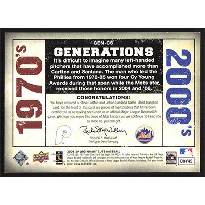 This is a 2008 SP Legendary Cuts Generations Dual Memorabilia Steve Carlton and Johan Santana Jerseys with Pinstripes baseball card. The card is #GEN-CS and pictures show condition.
