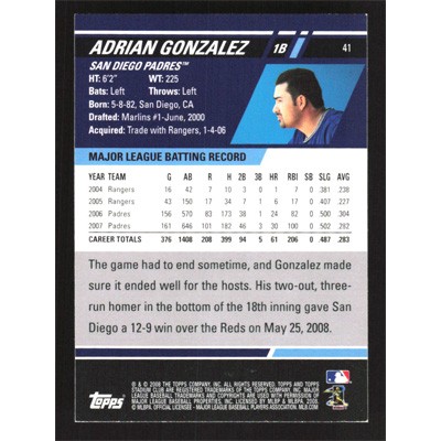 This is a 2008 Stadium Club Adrian Gonzalez baseball card. The card is #41 and pictures show condition.