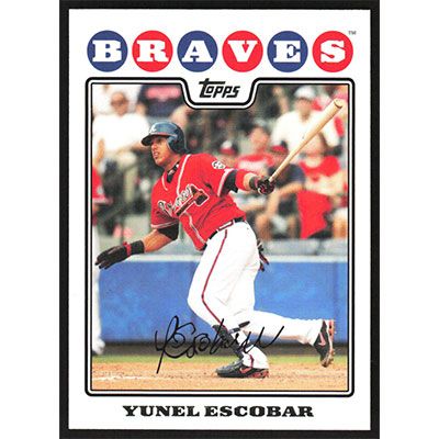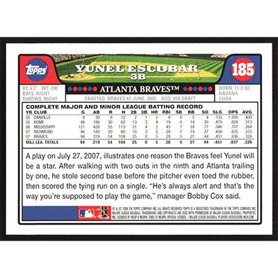 This is a 2008 Topps Yunel Escobar baseball card. The card is #185 and pictures show condition.