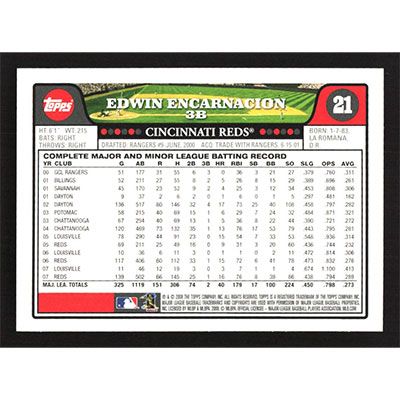 This is a 2008 Topps Edwin Encarnacion baseball card. The card is #21 and pictures show condition.