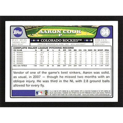 This is a 2008 Topps Aaron Cook baseball card. The card is #34 and pictures show condition.