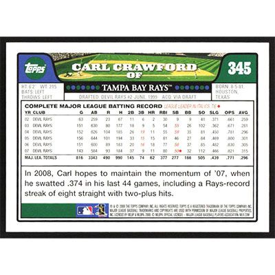 This is a 2008 Topps Carl Crawford baseball card. The card is #345 and pictures show condition.