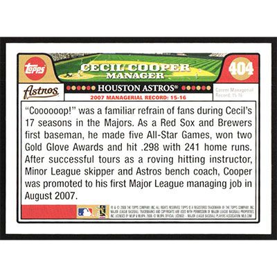 This is a 2008 Topps Cecil Cooper baseball card. The card is #404 and pictures show condition.