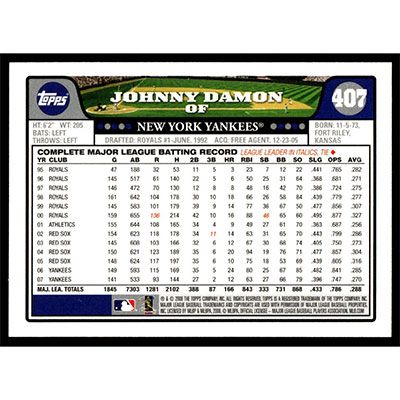 This is a 2008 Topps Johnny Damon baseball card. The card is #407 and pictures show condition.