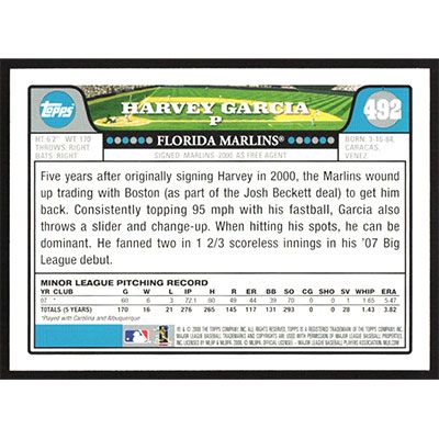 This is a 2008 Topps Harvey Garcia baseball card. The card is #492 and pictures show condition.