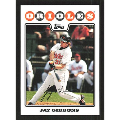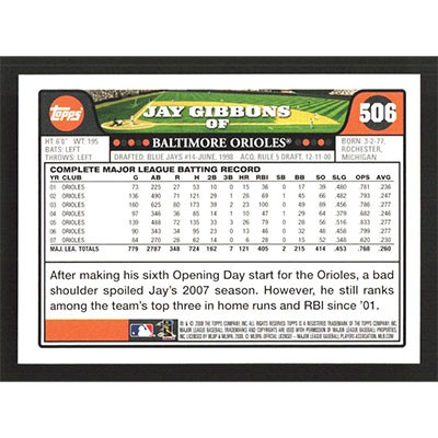 This is a 2008 Topps Jay Gibbons baseball card. The card is #506 and pictures show condition.