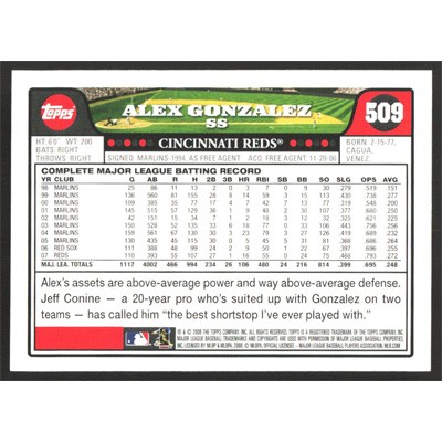 This is a 2008 Topps Alex Gonzalez baseball card. The card is #509 and pictures show condition.