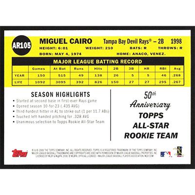 This is a 2008 Topps 50th Anniversary All-Rookie Team Miguel Cairo baseball card. The card is #AR105 and pictures show condition. Team(s): Tampa Bay Devil Rays
