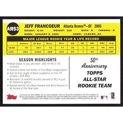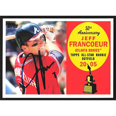 This is a 2008 Topps 50th Anniversary All-Rookie Team Jeff Francoeur autographed baseball card. This card has been signed, in blue, by Jeff Francoeur, and is guaranteed authentic by Ballcardz.com. The card is #AR53 and pictures show condition.