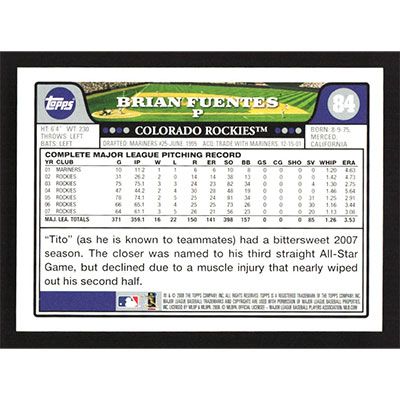 This is a 2008 Topps Brian Fuentes baseball card. The card is #84 and pictures show condition.