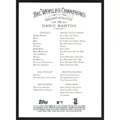 This is a 2008 Topps Allen & Ginter Daric Barton baseball card. The card is #199 and pictures show condition. Team(s): Oakland Athletics Rookie Card (RC)