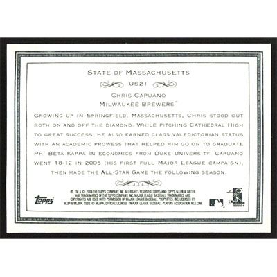 This is a 2008 Topps Allen & Ginter United States Chris Capuano baseball card. The card is #US21 and pictures show condition.