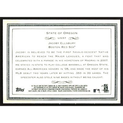This is a 2008 Topps Allen & Ginter United States Jacoby Ellsbury Oregon baseball card. The card is #US37 and pictures show condition. Team(s): Boston Red Sox