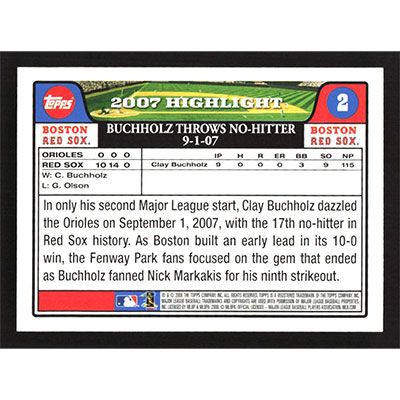 This is a 2008 Topps Gift Sets Clay Buchholz No Hitter baseball card. The card is #2 and pictures show condition.