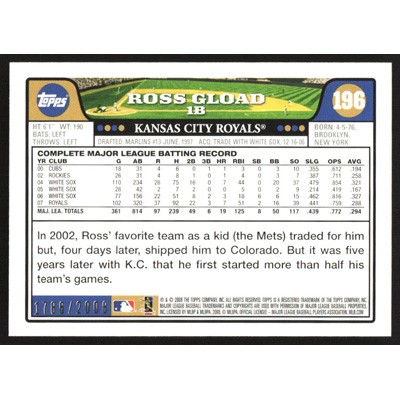 This is a 2008 Topps Gold Ross Gload baseball card. The card is #196 and pictures show condition. This card is limited; #'d 1786/2008. Team(s): Kansas City Royals