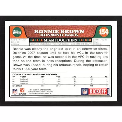 This is a 2008 Topps Kickoff Ronnie Brown football card. The card is #154 and pictures show condition.