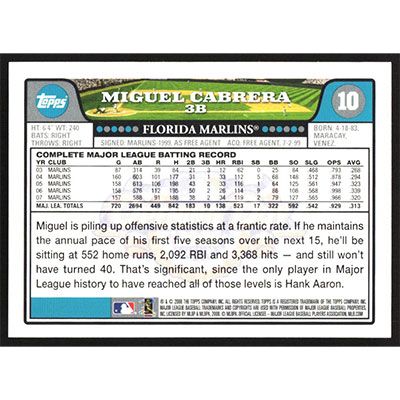 This is a 2008 Topps Opening Day Miguel Cabrera baseball card. The card is #10 and pictures show condition.