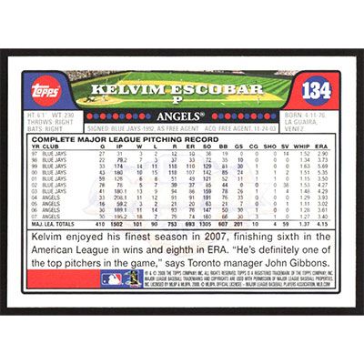 This is a 2008 Topps Opening Day Kelvim Escobar baseball card. The card is #134 and pictures show condition.