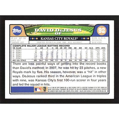 This is a 2008 Topps Opening Day David DeJesus baseball card. The card is #92 and pictures show condition.