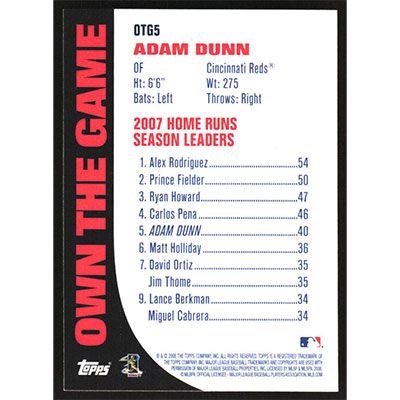 This is a 2008 Topps Own the Game Adam Dunn baseball card. The card is #OTG5 and pictures show condition.