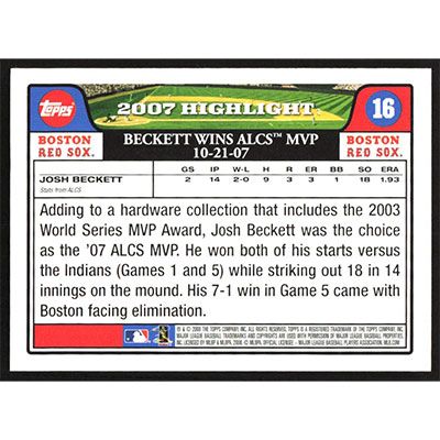 This is a 2008 Topps Red Sox Gift Set Josh Beckett Highlights baseball card. The card is #16 and pictures show condition.
