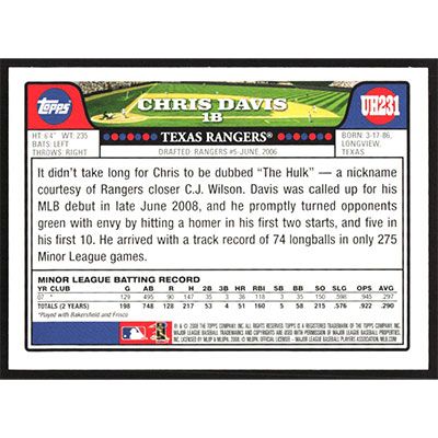 This is a 2008 Topps Update Chris Davis baseball card. The card is #UH231 and pictures show condition.