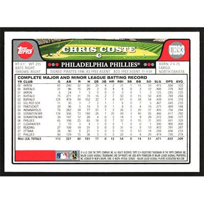 This is a 2008 Topps Update Chris Coste baseball card. The card is #UH93 and pictures show condition.
