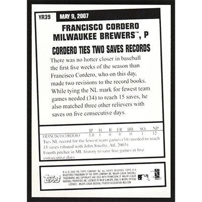 This is a 2008 Topps Year in Review Francisco Cordero baseball card. The card is #YR39 and pictures show condition.