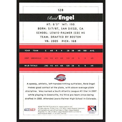 This is a 2008 TriStar PROjections Reid Engel baseball card. The card is #128 and pictures show condition.
