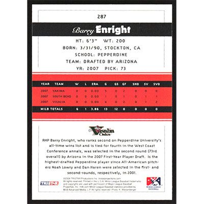 This is a 2008 TriStar PROjections Barry Enright baseball card. The card is #287 and pictures show condition.