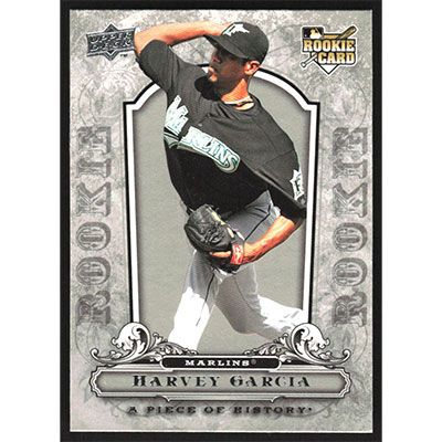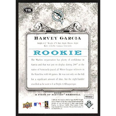 This is a 2008 UD A Piece of History Harvey Garcia baseball card. The card is #116 and pictures show condition. Team(s): Florida Marlins Rookie Card (RC)