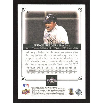This is a 2008 UD Masterpieces Prince Fielder baseball card. The card is #47 and pictures show condition.