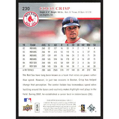This is a 2008 Upper Deck Coco Crisp baseball card. The card is #230 and pictures show condition.