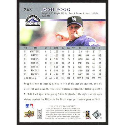 This is a 2008 Upper Deck Josh Fogg baseball card. The card is #243 and pictures show condition.
