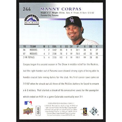 This is a 2008 Upper Deck Manny Corpas baseball card. The card is #244 and pictures show condition.