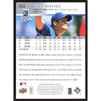 This is a 2008 Upper Deck Kyle Davies baseball card. The card is #253 and pictures show condition.