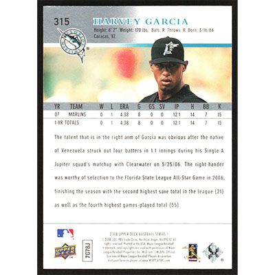 This is a 2008 Upper Deck Harvey Garcia baseball card. The card is #315 and pictures show condition.