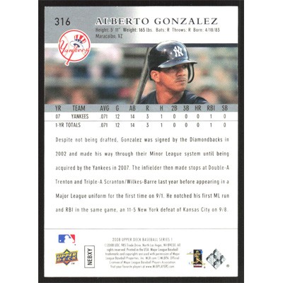 This is a 2008 Upper Deck Alberto Gonzalez autographed baseball card. This card has been signed, in blue, by Alberto Gonzalez, and is guaranteed authentic by Ballcardz.com. The card is #316 and pictures show condition.