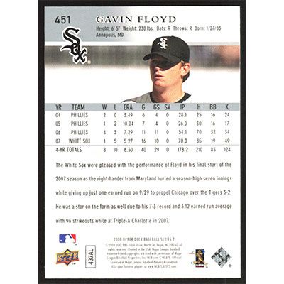This is a 2008 Upper Deck Gavin Floyd baseball card. The card is #451 and pictures show condition.