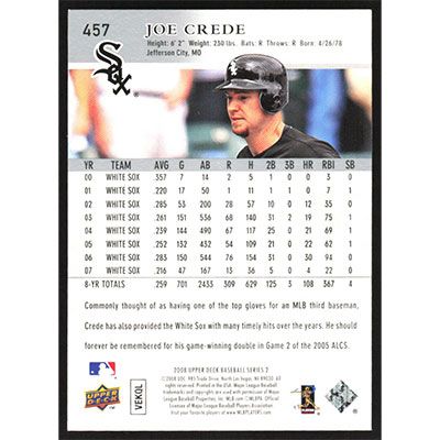 This is a 2008 Upper Deck Joe Crede baseball card. The card is #457 and pictures show condition.