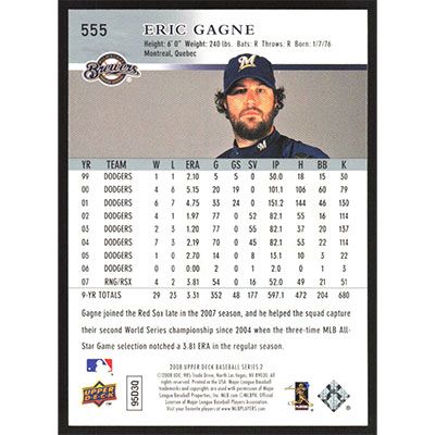 This is a 2008 Upper Deck Eric Gagne baseball card. The card is #555 and pictures show condition.