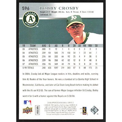 This is a 2008 Upper Deck Bobby Crosby baseball card. The card is #596 and pictures show condition.