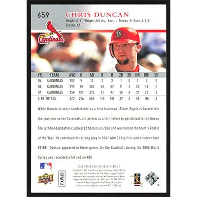 This is a 2008 Upper Deck Chris Duncan baseball card. The card is #659 and pictures show condition.