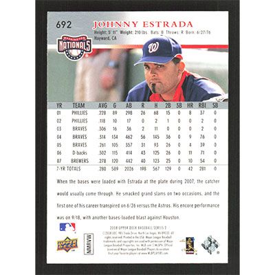 This is a 2008 Upper Deck Johnny Estrada baseball card. The card is #692 and pictures show condition.