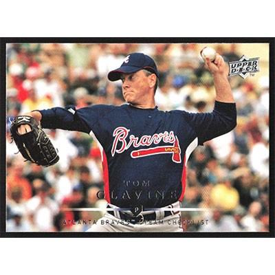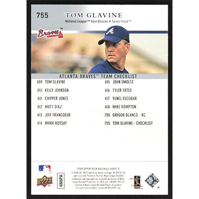 This is a 2008 Upper Deck Tom Glavine Team Checklist baseball card. The card is #755 and pictures show condition.