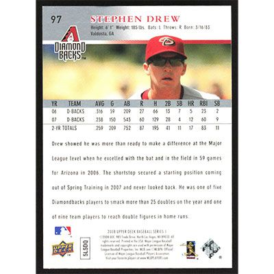 This is a 2008 Upper Deck Stephen Drew autographed baseball card. This card has been signed, in blue, by Stephen Drew, and is guaranteed authentic by Ballcardz.com. The card is #97 and pictures show condition.