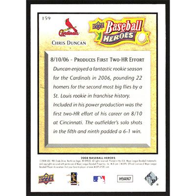 This is a 2008 Upper Deck Baseball Heroes Chris Duncan baseball card. The card is #159 and pictures show condition.