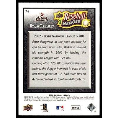 This is a 2008 Upper Deck Baseball Heroes Black Lance Berkman baseball card. The card is #74 and pictures show condition.